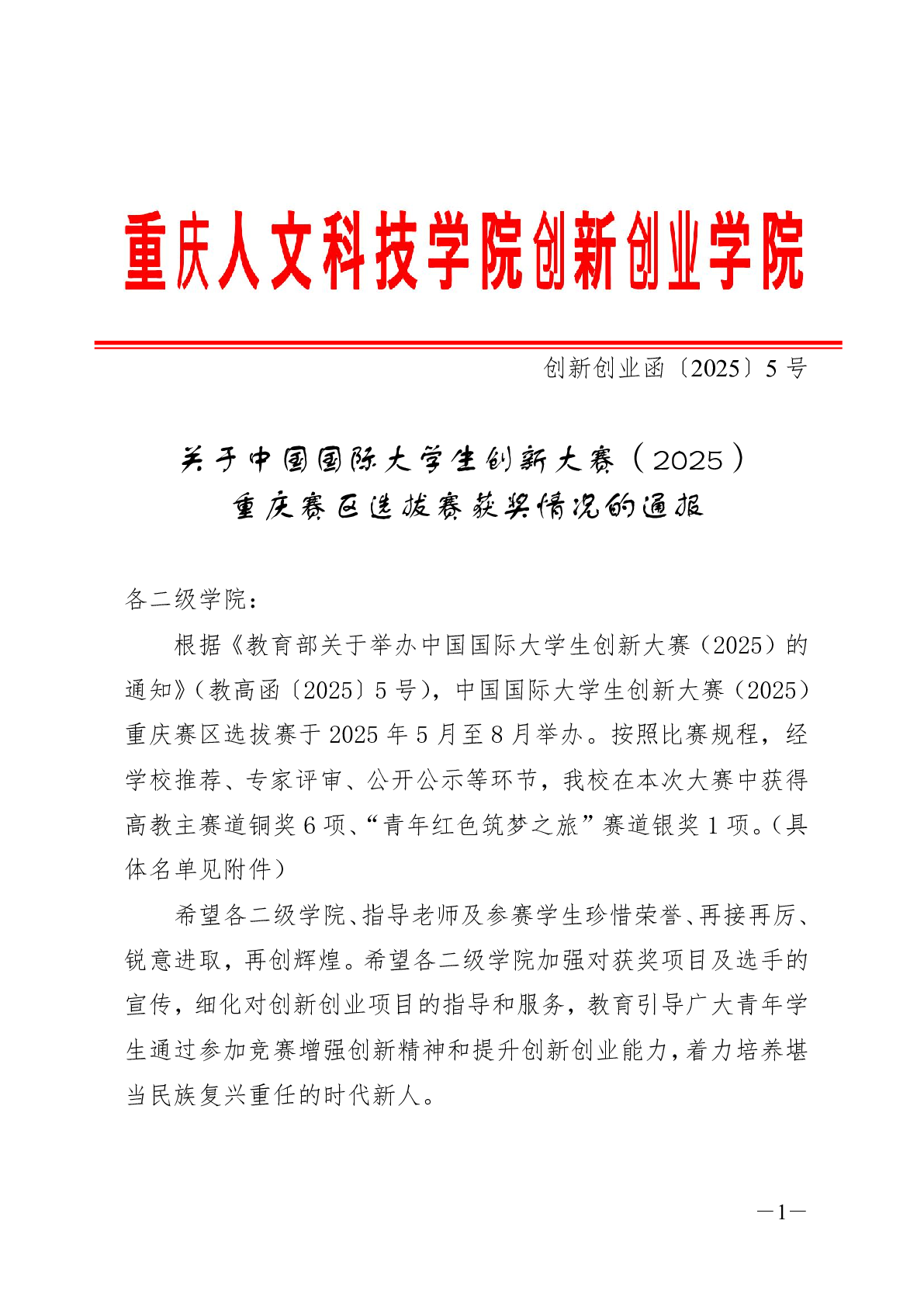 关于中国国际大学生创新大赛(2025) 重庆赛区选拔赛获奖情况的通报
