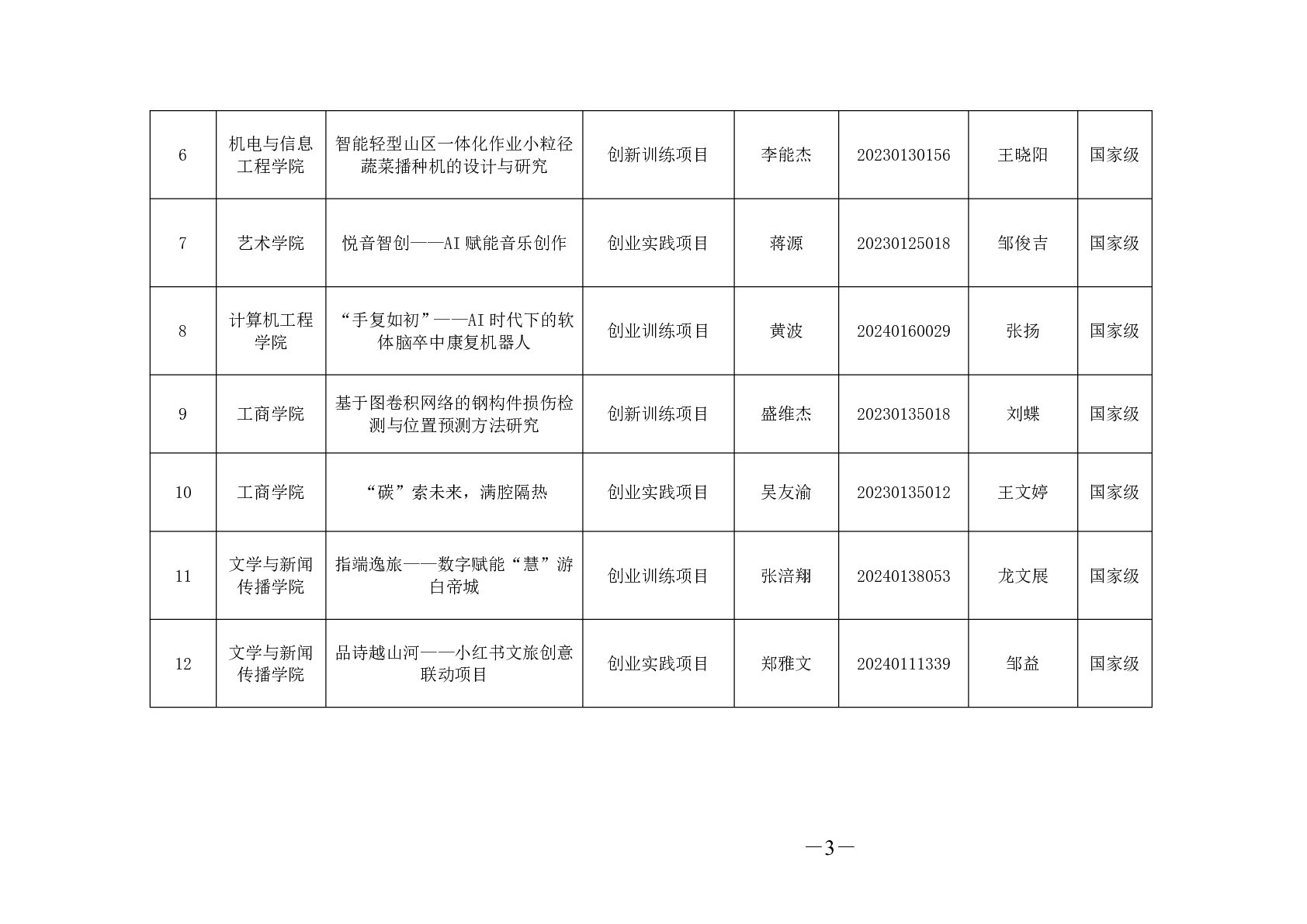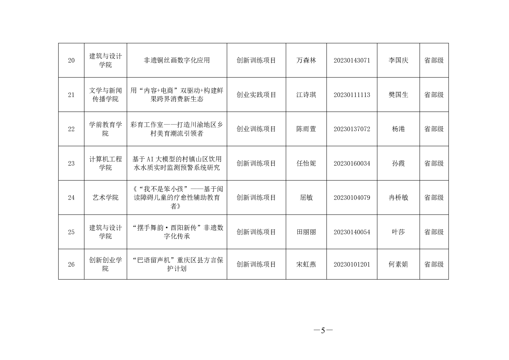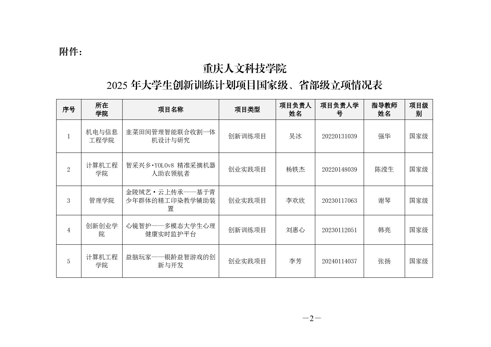 关于公布 2025 年大学生创新训练计划 项目国家级、省部级立项结果的通知