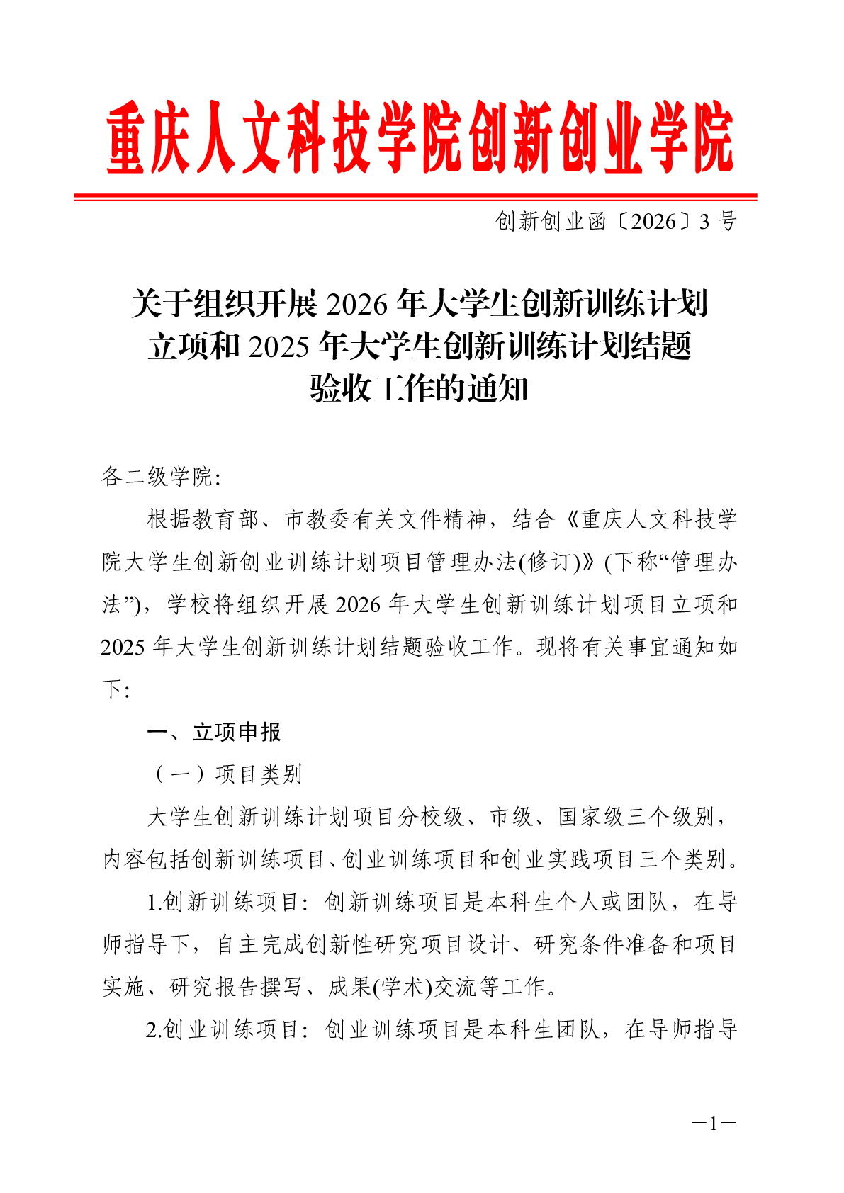 关于组织开展 2026 年大学生创新训练计划 立项和 2025 年大学生创新训练计划结题 验收工作的通知